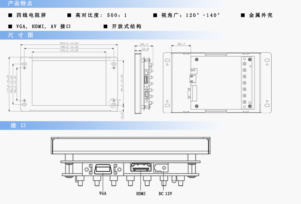 觸摸屏:4線電阻屏(可選:5線電阻屏)