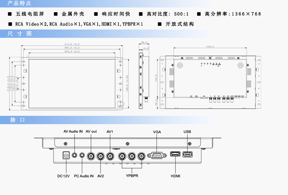 輸入信號:RCA Video×2,RCA Audio×1,VGA×1,HDMI×1,YPBPR×1