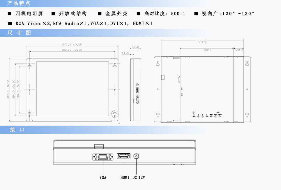 | 輸入信號(hào) | RCA Video×2,RCA Audio×1,VGA×1,DVI×1,HDMI×1 | ||
