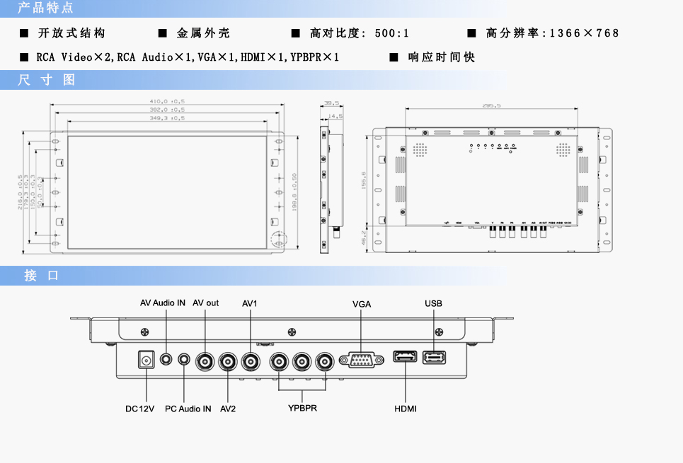 輸入信號:RCA Video×2,RCA Audio×1,VGA×1,HDMI×1,YPBPR×1