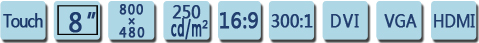 高分辨率: 800×480 高亮度:250cd/m2 對比度:300:1 材質:鐵 尺寸:229.1×128.9×34.5mm 輸入信號:RCA Video×2,RCA Audio×1,VGA×1,DVI×1,HDMI×1